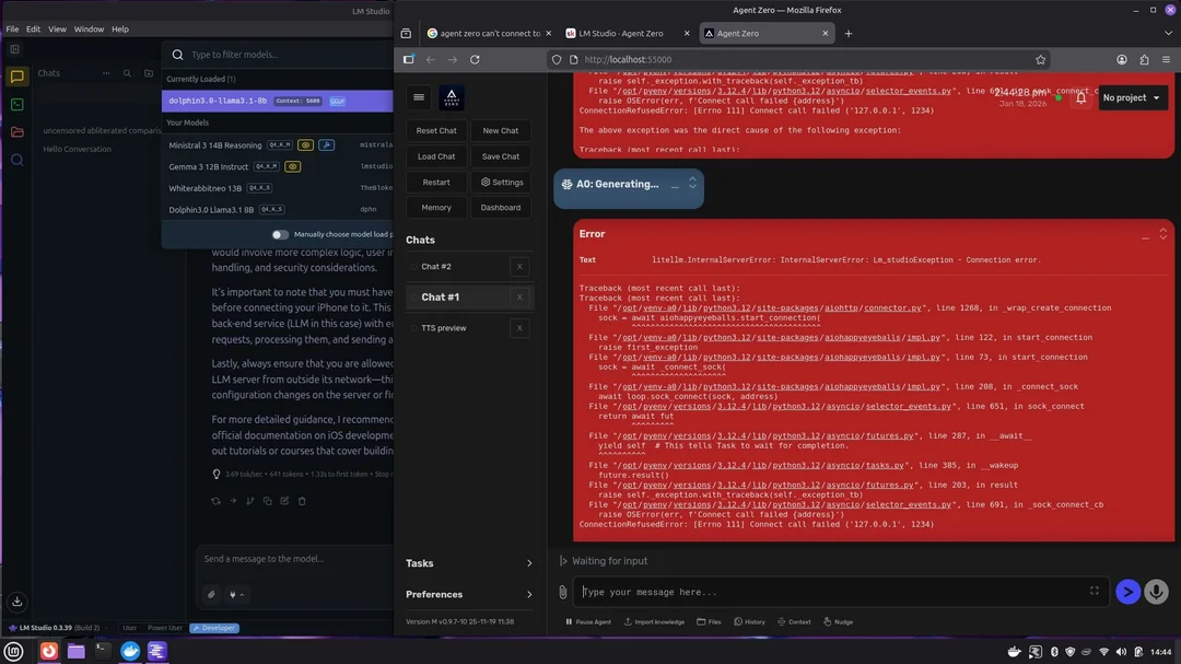 | Inconsistent results between LM Studio & Ollama | Different default generation parameters (temperature, top‑p). | • Explicitly set these in Agent Zero’s GENERATION_CONFIG env var (e.g., {"temperature":0.7,"top_p":0.9}) to match the UI settings you prefer. |
